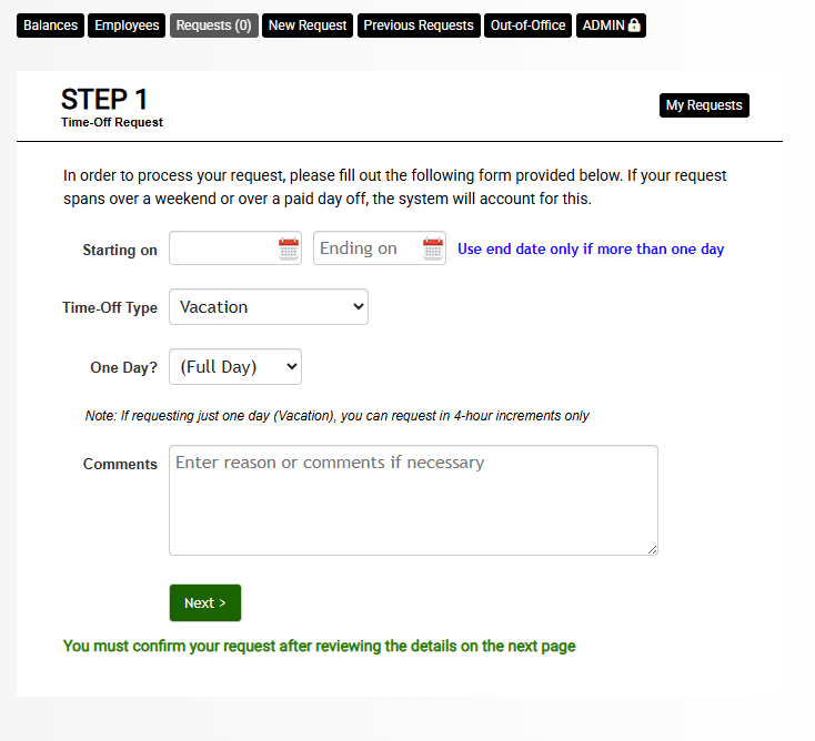 With multiple levels of approvals and transparency throughout the process, the time-off system can simplify your request process. Employees can see where their requests are in the approval process and both employees and managers can view time off balances.